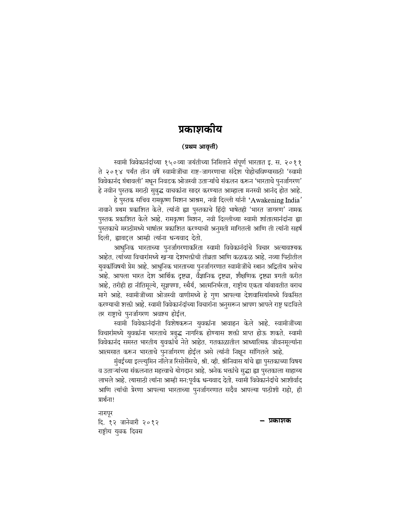 आधुनिक भारताच्या पुनर्जागरणाकरिता स्वामी विवेकानंदांचे विचार अत्यावश्यक आहेत. त्यांच्या विचारांमध्ये खर्या देशभक्तीची तीव्रता आणि कळकळ आहे. नव्या पिठीतील युवकांविषयी प्रेम आहे. आधुनिक भारताच्या पुनर्जागरणात स्वामीजींचे स्थान अद्वितीय असेच आहे. आपला भारत देश आर्थिक दृष्ट्या, वैज्ञानिक दृष्ट्या, शैक्षणिक दृष्ट्या प्रगती करीत आहे, तरीही हा नीतिमूल्ये, सूज्ञपणा, स्थैर्य, आत्मनिर्भरता, राष्ट्रीय एकता यांबाबतीत बराच मागे आहे. स्वामीजींच्या ओजस्वी वाणीमध्ये हे गुण आपल्या देशवासियांमध्ये विकसित करण्याची शक्ती आहे. स्वामी विवेकानंदांच्या विचारांना अनुसरून आपण आपले राष्ट्र घडविले तर राष्ट्राचे पुनर्जागरण अवश्य होईल. स्वामी विवेकानंदांनी विशेषकरून युवकांना आवाहन केले आहे. स्वामीजींच्या विचारांमध्ये युवकांना भारताचे प्रबुद्ध नागरिक होण्यास शक्ती प्राप्त होऊ शकते. स्वामी विवेकानंद समस्त भारतीय युवकांचे नेते आहेत. गतकाळातील आध्यात्मिक जीवनमूल्यांना आत्मसात करून भारताचे पुनर्जागरण होईल असे त्यांनी निक्षून सांगितले आहे.