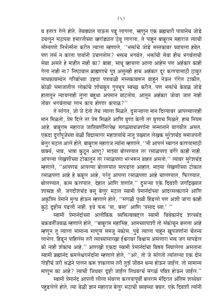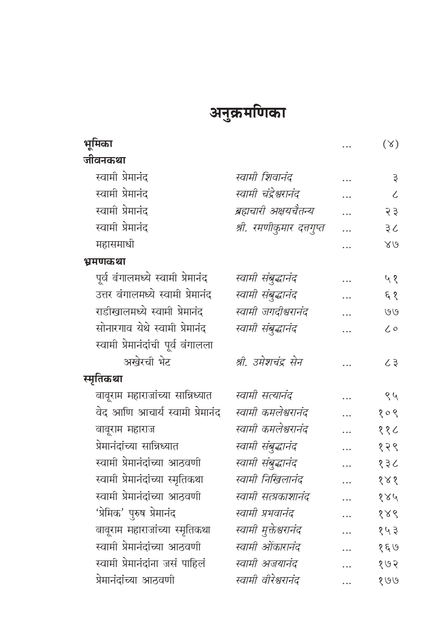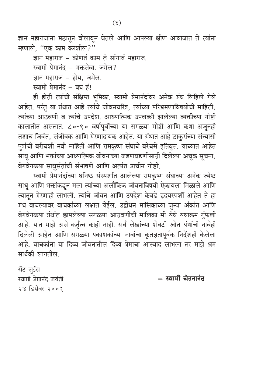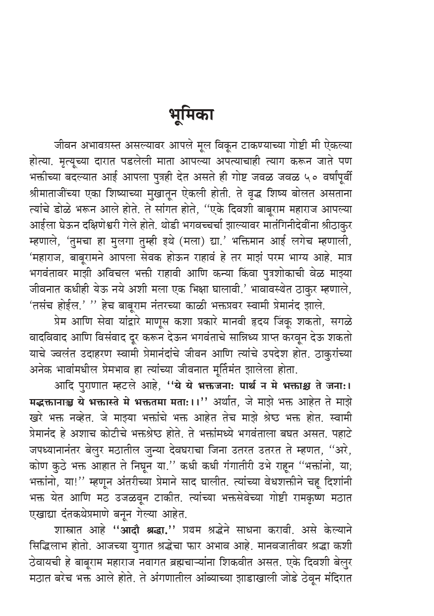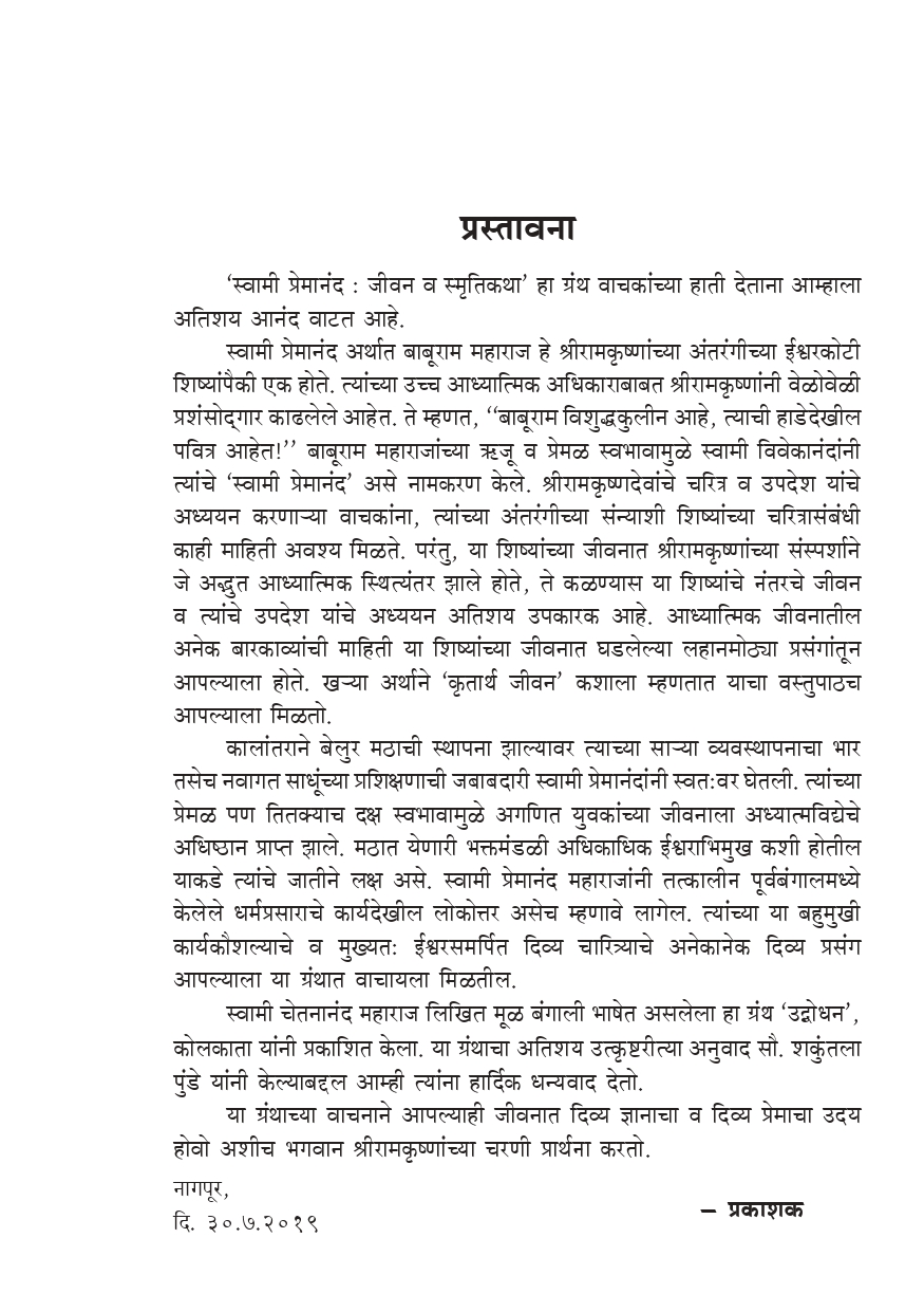 स्वामी प्रेमानंद अर्थात बाबूराम महाराज हे श्रीरामकृष्णांच्या अंतरंगीच्या ईश्वरकोटी शिष्यांपैकी एक होते. त्यांच्या उच्च आध्यात्मिक अधिकाराबाबत श्रीरामकृष्णांनी वेळोवेळी प्रशंसोद्गार काढलेले आहेत. ते म्हणत, “बाबूराम विशुद्धकुलीन आहे, त्याची हाडेदेखील पवित्र आहेत!” बाबूराम महाराजांच्या ऋजू व प्रेमळ स्वभावामुळे स्वामी विवेकानंदांनी त्यांचे ‘स्वामी प्रेमानंद’ असे नामकरण केले. श्रीरामकृष्णदेवांचे चरित्र व उपदेश यांचे अध्ययन करणाऱ्या वाचकांना, त्यांच्या अंतरंगीच्या संन्याशी शिष्यांच्या चरित्रासंबंधी काही माहिती अवश्य मिळते. परंतु, या शिष्यांच्या जीवनात श्रीरामकृष्णांच्या संस्पर्शाने जे अद्भुत आध्यात्मिक स्थित्यंतर झाले होते, ते “कळण्यास या शिष्यांचे नंतरचे जीवन व त्यांचे उपदेश यांचे अध्ययन अतिशय उपकारक आहे. आध्यात्मिक जीवनातील अनेक बारकाव्यांची माहिती या शिष्यांच्या जीवनात घडलेल्या लहानमोठ्या प्रसंगांतून आपल्याला होते. खऱ्या अर्थाने ‘कृतार्थ जीवन’ कशाला म्हणतात याचा वस्तुपाठच आपल्याला मिळतो.